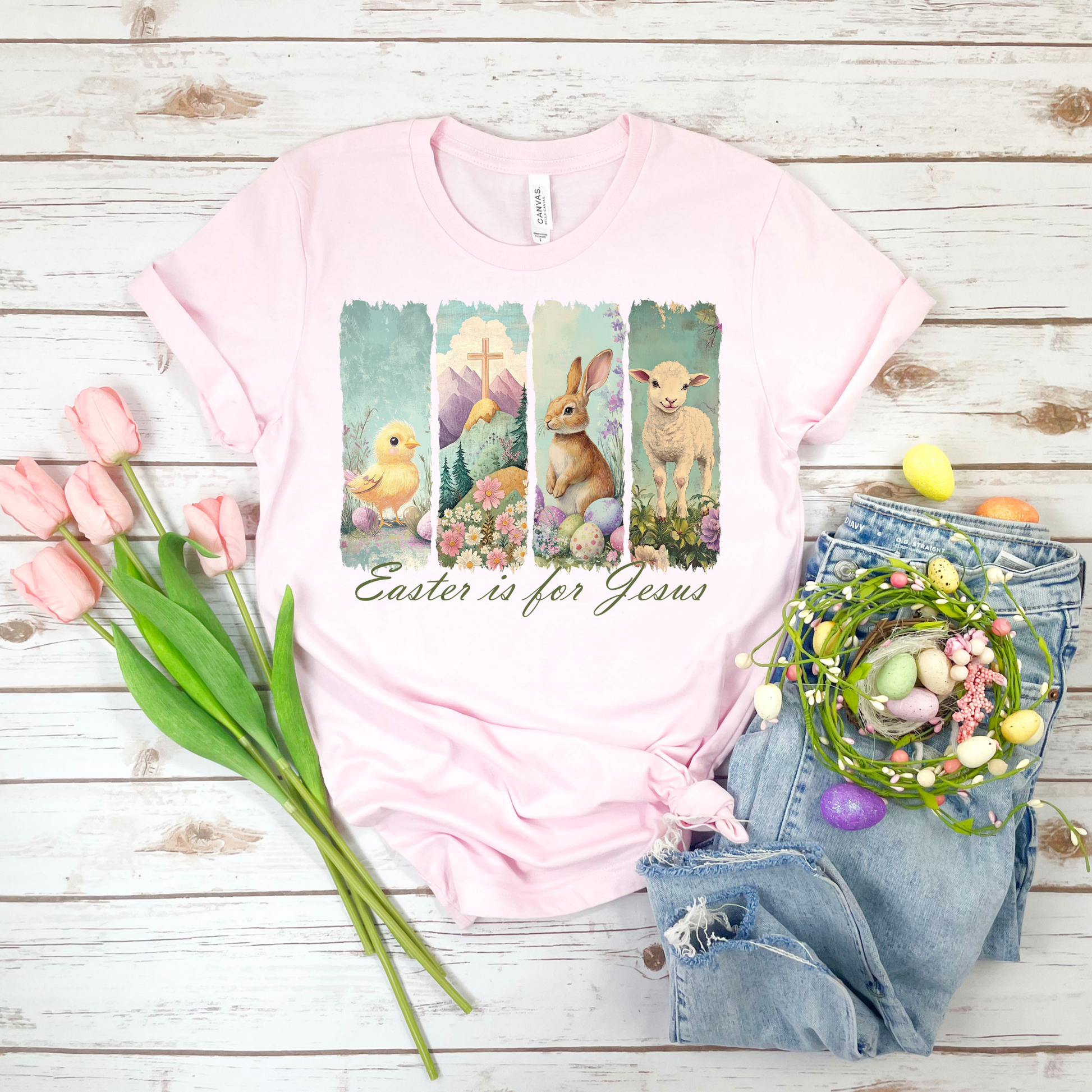 Easter is for Jesus is offered on a Soft Pink Bella Canvas T-Shirt.