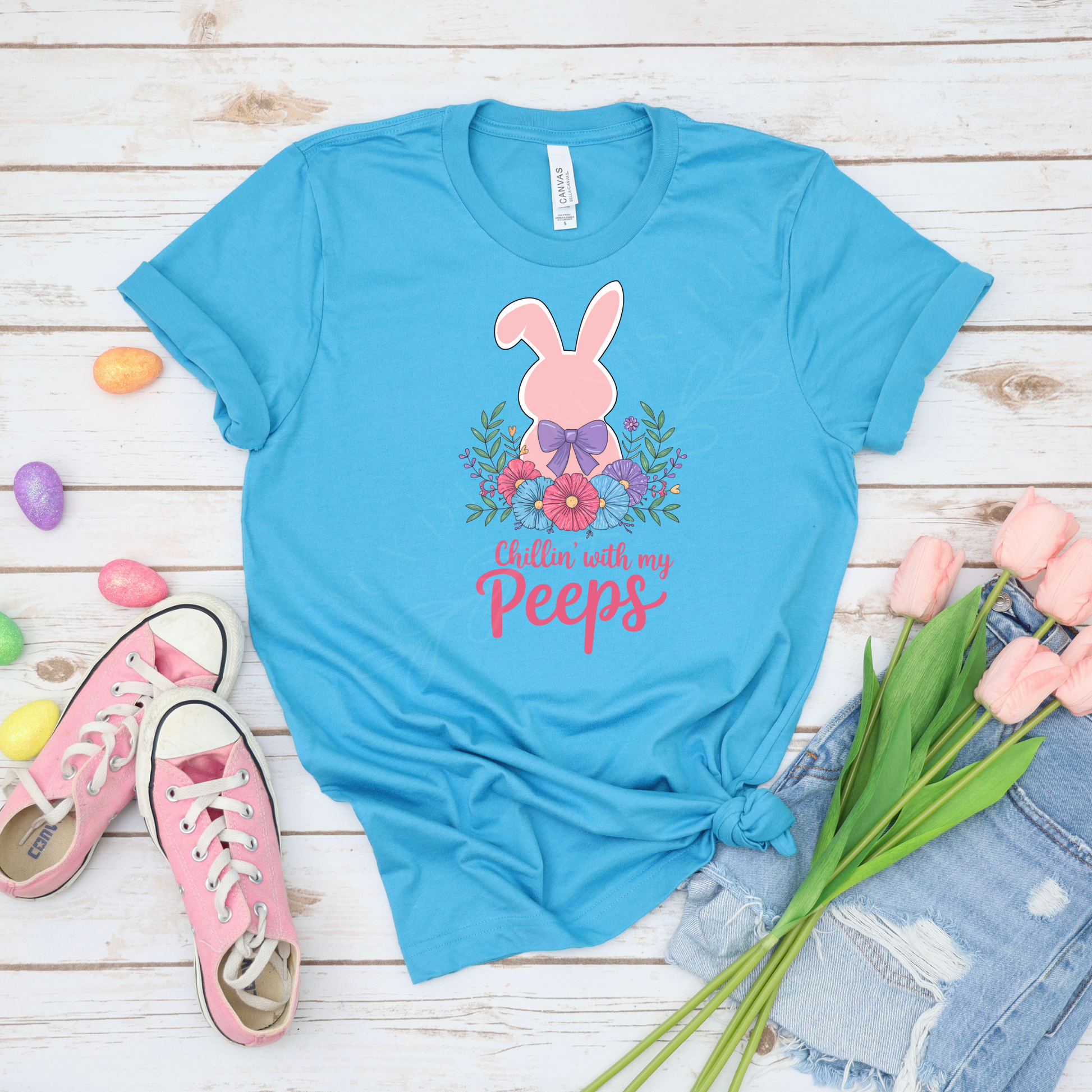 Chillin with my Peeps is offered on a Aqua Bella Canvas T-Shirt.