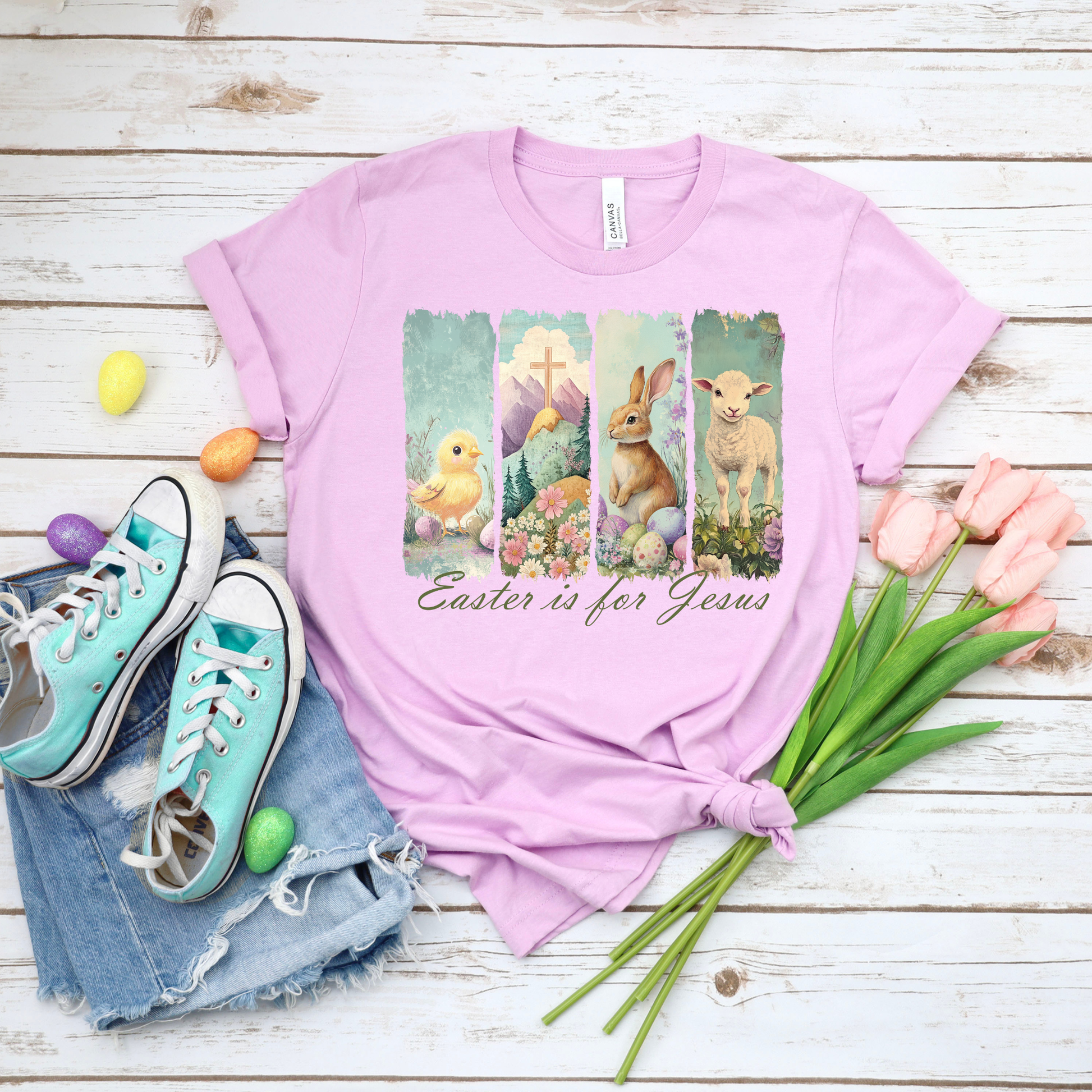 Easter is for Jesus is offered on a Lilac Bella Canvas T-Shirt.