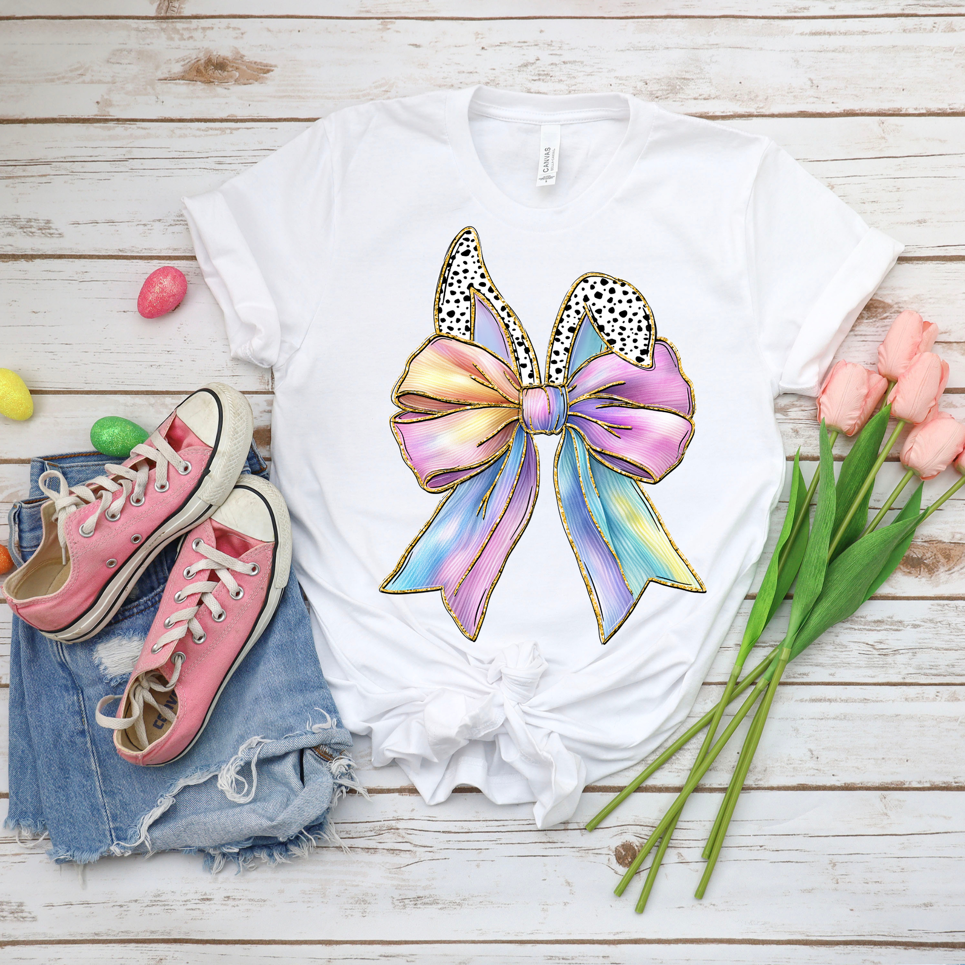Spotted Ears Bow is offered on a White Bella Canvas T-Shirt.